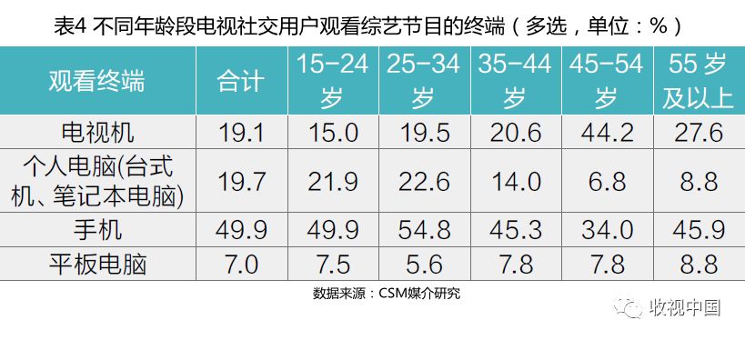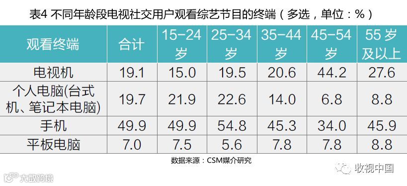 从讨论电视节目使用的观看终端观察,虽然各年龄段电视社交用户在不同类型节目的收看终端方面存在一定的差异,但手机已经取代电视机和个人电脑等设备成为最主要的观看终端。随着智能手机的全面普及,更多的用户选择在手机终端上观看电视节目并通过社交平台发表看法。手机终端中传播的内容更有利于电视社交用户便捷的在观看和讨论间进行无缝切换。