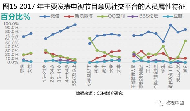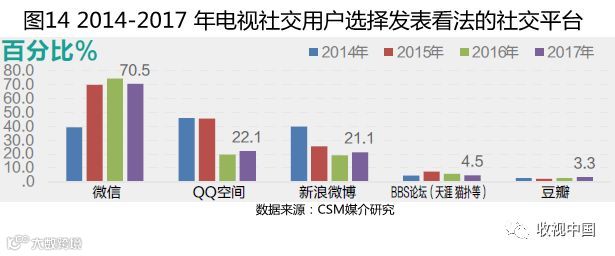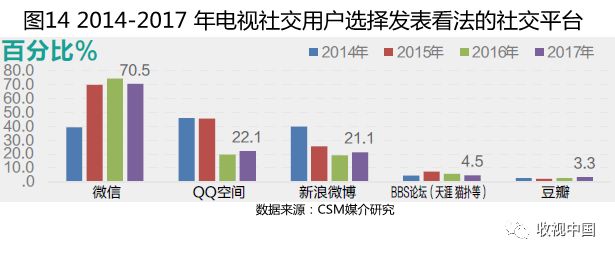 虽然微信在电视社交用户中的比例近三年保持稳定,但在由于电视社交用户在整体人群中的比例在近两年连续下滑,以所有人群为统计口径的比例数值也在逐年下滑,2017年使用微信发表对电视节目看法的人群在整体人群中的比例数值为2.8%,略高于2014年的2.5%,远低于2015年的4.7%。