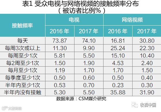 [4]表1,电视媒介接触受众包含在家中和家外接触电视的受众;网络视频接触受众包含在线观看网络视频和下载网络视频的受众。