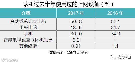 此外,随着智能收视设备的普及的发展,观众不仅可以通过互联网电视机顶盒或智能电视点播、回看电视节目,而且还可以通过智能电视选择收看网络上自己喜欢的节目,依据CSM十二城市基础研究数据,在过去半年使用过上网设备的十五岁及以上受众中,通过智能电视或互联网机顶盒上网的受众比例达到6.2%,未来智能电视和互联网机顶盒的广泛应用或将进一步助力网络视频的消费(表4)。