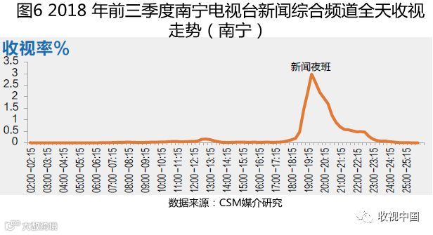 由南宁电视台新闻综合频道制作并播出的《新闻夜班》是一档以平民性、贴近性、生活化为特色的民生新闻栏目。主要报道南宁百姓的身边事、关心事。开播以来几经改版,逐渐以其日益成熟的平民风格及浓郁的地域色彩获得南宁观众的喜爱。一方面,节目报道精准及时:白天刚发生的事情,在晚上节目中就会马上报道,贴近实际、贴近生活、贴近群众,使得节目更具吸引力及感染力;另一方面,节目会在新闻播报之后立即给出评论,针砭时弊:主持人不仅可以适当加入自身对播报内容的看法,还会适时连线社会人士,发表对某一现象或某一事件的简要点评,拓展节目对新闻的阐释。值得注意的是,《新闻夜班》的播出时间处于电视剧竞争十分激烈的19:30-20:30时段,从全天收视来看,《新闻夜班》不仅没有受到竞争的影响,而且取得了全频道全天最高的收视水平,是不折不扣的王牌节目(图6)。