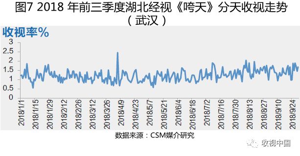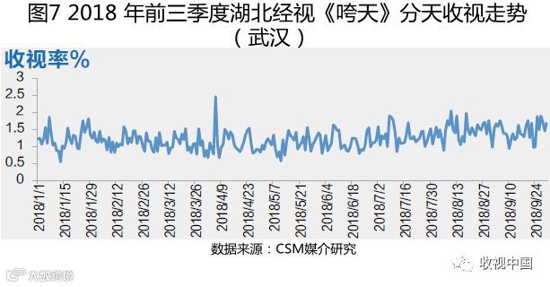 《咵天》是湖北经视的日播方言社会新闻故事类栏目,节目定位为家长里短;节目理念是用故事手段讲述人生酸甜苦辣,以人文关怀体现媒体社会责任。节目内容以家庭为核心,涉及亲情故事、家庭纠纷、邻里互助、扯皮拉筋、社区帮扶、奇闻趣事等等,风格故事化,注重新闻的故事性和趣味性。节目除了具备与其他地面频道新闻时事类节目相似的内容及编排形式外,还充分利用本土优势:用市民熟悉的武汉方言讲老百姓身边发生的事。除此之外,节目中大量采用了湖北大鼓、湖北道情、渔鼓、慢板等湖北传统的曲艺表现形式,形成了主持角色化,新闻故事化,包装娱乐化的栏目特色。自开播以来,《咵天》的收视一直在武汉地区位居同时段前列,栏目的社会影响力和美誉度始终领先,逐渐成为湖北经视的品牌栏目,深受观众喜爱,即使是在电视市场逐渐萎缩的大背景下, 2018年前三季度节目的收视走势依然呈现出上扬态势(图7)。