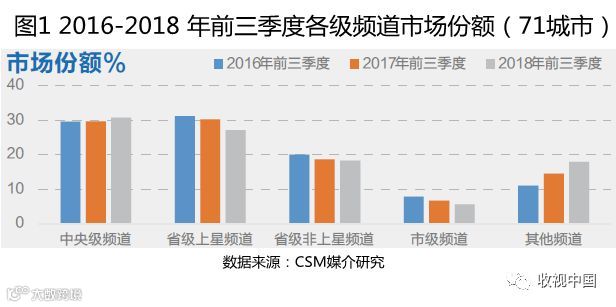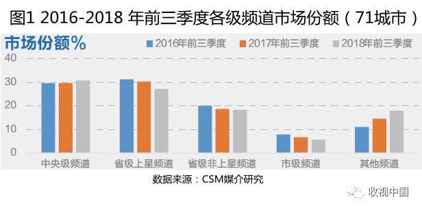 从全国各级频道组近三年来的市场竞争力走势来看,中央级频道(包含中央电视台与中国教育台)2016至2017年前三季度比较并无太大变化,而2018年前三季度较同时期竞争力明显提升;与此同时,省级上星频道的竞争能力却在逐年下滑,且幅度较大;其他频道组的收视份额幅度大幅提升,非直播收视近年来增长迅速;相比上星频道,省级地面频道显得相对平稳,虽然市场也在逐渐缩小,但幅度不大;市级频道则不容乐观,受到各级强势频道的不断挤压,连续三年呈现出较为明显的下滑态势(图1)。