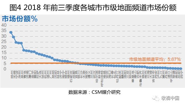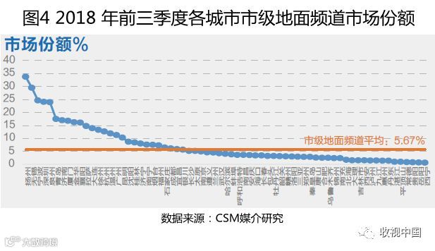 相对于省级地面频道,市级地面频道在不同城市的差异更为明显,尤其是在那些竞争力相对更强的城市当中差异更为突出。2018年前三季度,竞争力领先的五城市为扬州、无锡、宁波、深圳、泉州,其中扬州市级地面频道市场份额最高,在当地收获了33.65%的份额;排名第五的泉州市级频道份额为23.88%。其他城市的竞争力均未超过20%(图4)。