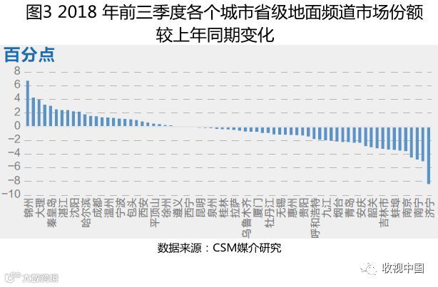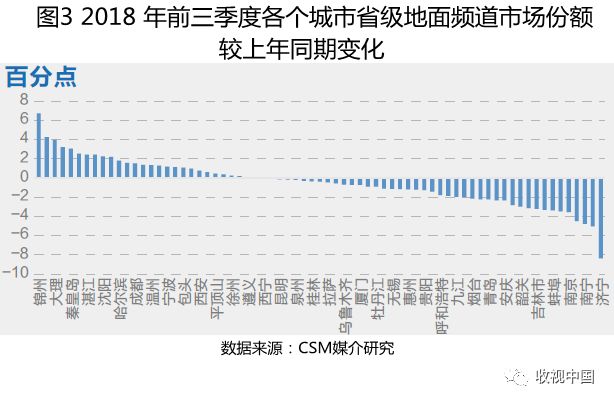 在省级地面频道2018年前三季度整体同比变化不大的情况下,不同城市的增减幅变化则呈现出明显的差异。总体而言,竞争力增长的城市个数少于市场份额同比下滑的城市个数。71个城市中,省级地面频道竞争力增长的城市为28个,其中锦州市场省级地面频道的增长最为明显,之后依次为北海、大理、天津和秦皇岛市场(图3)。