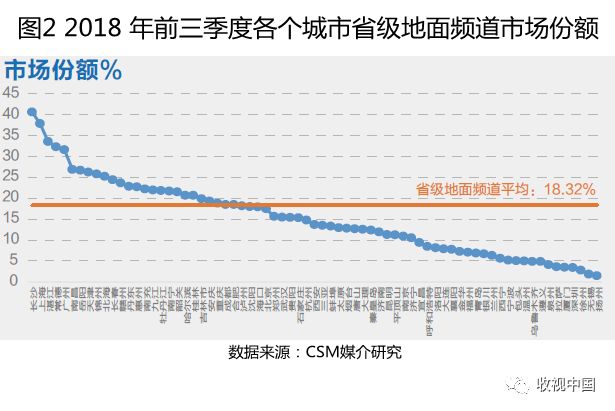 从不同城市的省级地面频道的竞争力可以看出,各城市的省级非上星频道竞争实力差异较大。2018年前三季度,竞争力较强的五个城市依次为长沙、上海、湛江、常德、广州,形成了省级地面频道竞争力较强的第一梯队,且较其他城市领先优势明显。这五个城市自身的省级地面频道竞争力差异也相对较大,其中,刨除了湖南卫视、湖南金鹰卡通之外的湖南省地面频道在长沙地区市场份额达到40.58%,而排在第五位的广州,其广东省地面频道则在广州收获了31.56%的市场份额(图2)。