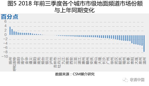 与省级地面频道相比,2018年前三季度,市级地面频道与2017年同期相比下滑面更大,除直辖市以外,只有22个城市市场份额有所增加,但增幅明显低于下滑的幅度,增长最高的扬州市场份额增加了3.79个百分点,其次是拉萨,增长了2.78个百分点,其他城市的增幅均未超多2个点(图5)。