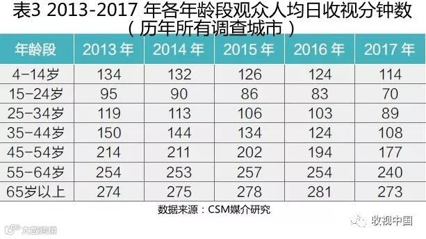 从各年龄段观众的人均日收视时长看(表3),35-54岁中年观众成为收视量同比绝对值下降最大的群体,其中35-44岁观众同比下降16分钟;45-54岁观众下降17分钟。55岁以上的中老年观众的收视时间五年来首次出现下降。由此看出,电视收视量的下滑已经开始蔓延到中老年观众,新媒体对电视受众进一步分流。