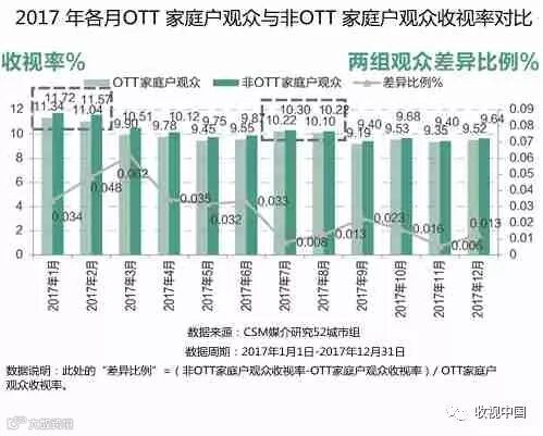 总体而言,2017年OTT家庭户观众收视率略低于非OTT家庭户观众。分月来看,2017年上半年,OTT家庭户观众与非OTT家庭户观众在2017年1月、2月的直播收视率均高于其它月份,收视率超过11%。2017年下半年,OTT家庭户观众与非OTT家庭户观众在7月、8月暑期的直播收视率也较高,收视率超过10%。就两组观众的收视差异比例(非OTT家庭户观众较OTT家庭户观众的差异比例)而言,两组观众在第四季度的差异较小,在第一季度差异较大。