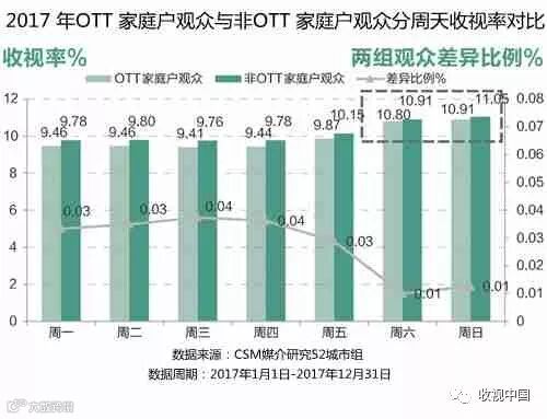 分周天来看,OTT家庭户观众与非OTT家庭户观众周末两天的收视率明显高于工作日,均在11%左右。另外,两组观众在周末的差异比例也明显小于工作日,与工作日相比,OTT家庭户观众在周末的收视率较非OTT家庭户观众提升更多。