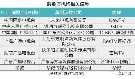 牌照方是OTT内容的播控机构。国家广电总局于2009年8月14日正式下发《关于加强以电视机为接收终端的互联网视听节目服务管理有关问题的通知》,通知要求厂商如果通过互联网连接电视机或机顶盒等电子产品,向电视机终端用户提供视听节目服务,应当按照《互联网视听节目服务管理规定》和《专网及定向传播视听节目管理办法》的有关规定,取得“以电视机为接收终端的视听节目集成运营服务”的《信息网络传播视听节目许可证》。取得该牌照的机构相关信息如表1: