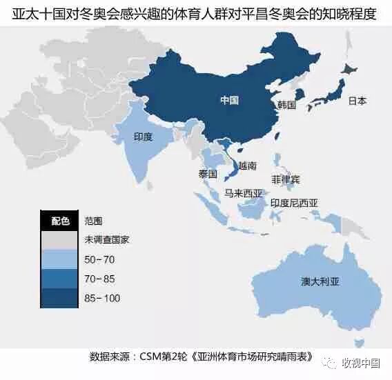 被纬度影响的冬季项目决定了冬奥会的受众认知分布不均衡。如中国南北体育受众对冬奥的不同收视态度一样,对于年初结束的平昌冬奥会,亚太十国的体育受众认知度出现了明显的差异。以中国、日本和韩国为代表“北方之国”知道平昌冬奥会的比例大于等于88%。而其他位于中国南部的调研国家体育受众对平昌冬奥会的认知比例均在71%及以下,与中日韩差距明显,这种地域差异也直接限制了冬季运动的活跃区间。