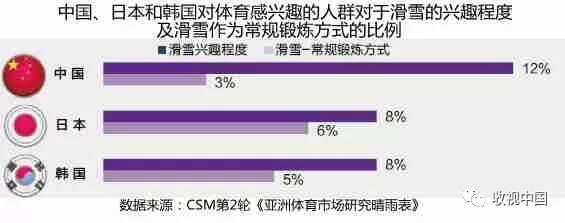 而滑雪,作为冬季项目的基础竞技类运动,也被当作一种休闲体育运动方式。一般情况下,会滑雪的人会更愿意关注滑雪。但是,在中国,雪场基本上开在中国的北方并且还要受到天气和地理位置等等的影响。因此,欣赏滑雪比自己体验滑雪要容易得多。这也就解释了中国人在滑雪的兴趣比例(12%)与滑雪作为常规锻炼方式的比例(3%)上形成的巨大差距。而日本和韩国这两个比例差距就更加均衡,也更为合理。