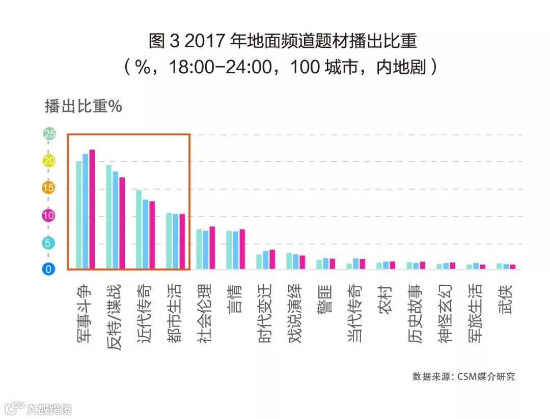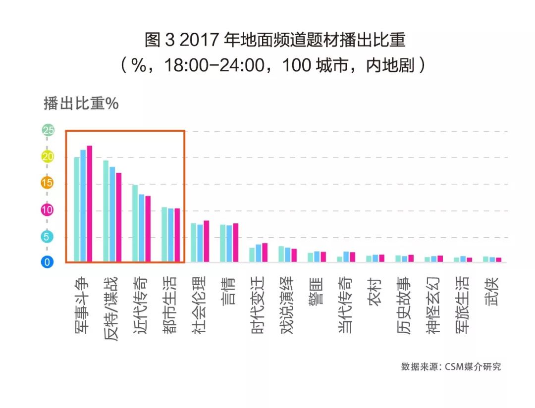 地面频道面对深刻变化的电视剧市场,显得应变乏力,整体竞争力日渐式微,所选择的题材也多以“高性价比”为主。数据显示地面频道近三年来的大类题材十分固定,呈现出高度集中化的态势,军事斗争、反特/谍战、近代传奇、都市生活四大类合计占据总量的60%多。军事斗争剧“好看不贵”,性价比极高,占比每年稳步提升,反特/谍战、近代传奇题材持续下滑,都市生活则保持稳定状态。