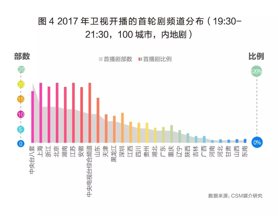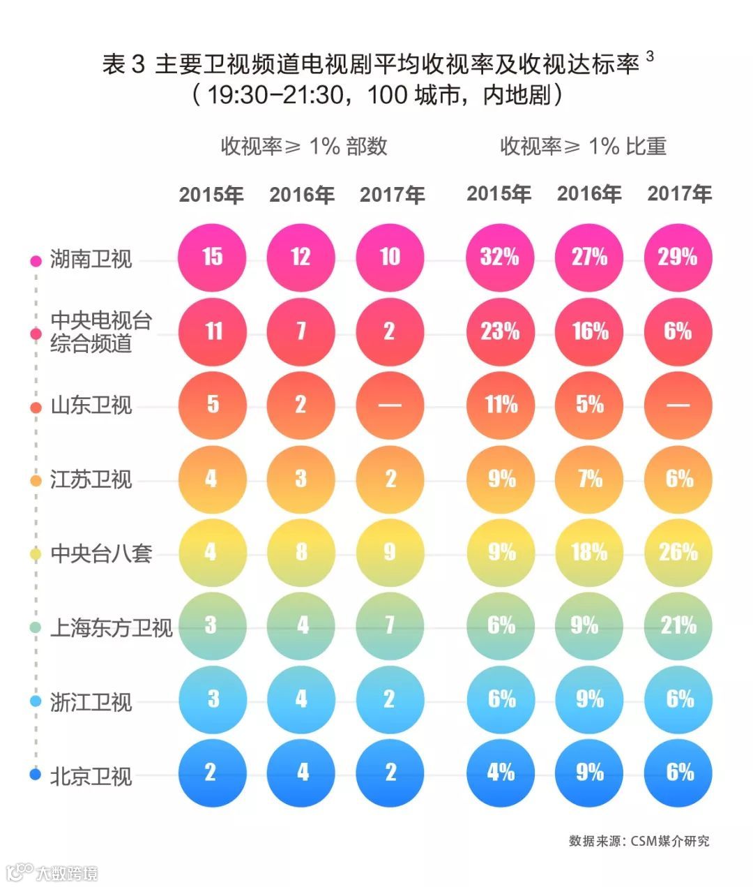 从收视效果看,强势卫视阶层固化已然全盘实现!强势卫视悍然垄断了收视率超1%的好剧资源。2017年,晚黄首轮剧收视率超1%的剧分布的频道数减少到7个:湖南卫视有10部(含1部2016年开播的剧)占近1/3,中央台八套有9部(含1部2016年开播的剧),上海东方卫视占7部、中央台一套、浙江、江苏、北京这四家卫视各占2部。