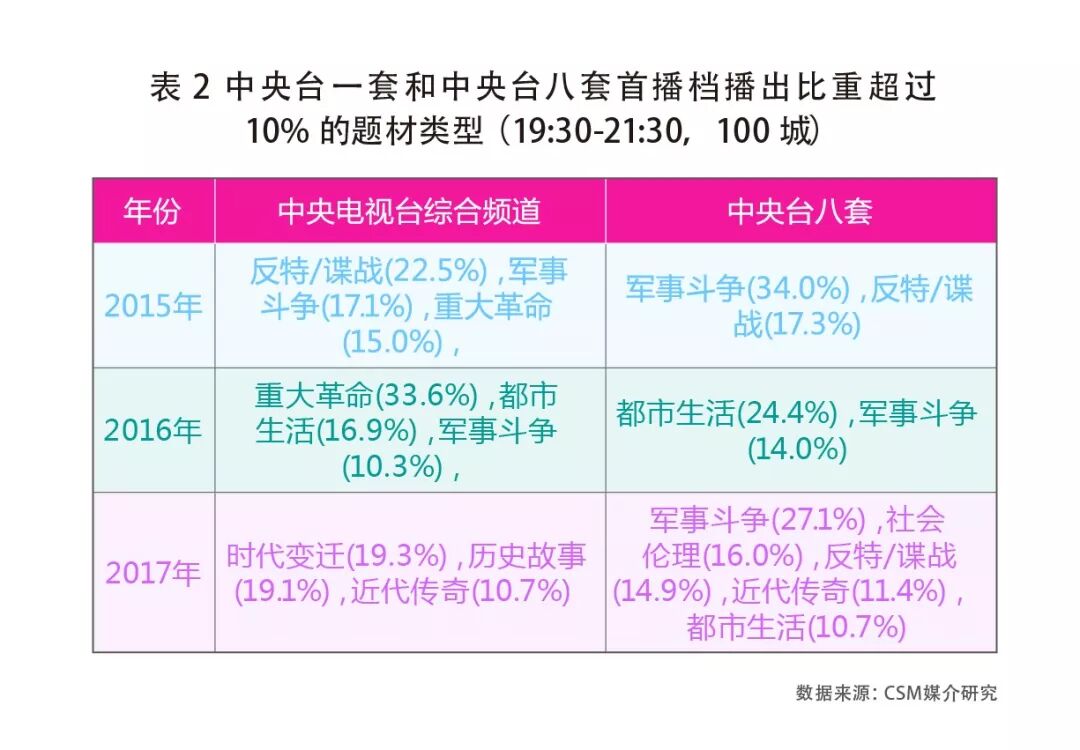 中央台一套和中央台八套晚黄首播档剧目题材有较大差别。中央台一套更偏向于叙事宏大、格局高远、主旋律强的剧作,例如题材中的“重大革命”在2016年占比超过三分之一,“军事斗争”超过10%,2017年年代感强、有历史底蕴的“时代变迁”和“历史故事”成为首选题材,二者比重均超过19%,加起来占近四成,“近代传奇”占10.7%。中央台八套近三年来的大类题材比重经历了从集中到分散的过程,2015-2016年超过10%的播出比重仅集中在两类题材上,进入2017年则分散到五类题材上,军事斗争剧高高在上达到27%,“社会伦理”、“反特/谍战”、“近代传奇”和“都市生活”剧则和市场总体选择相差不大。