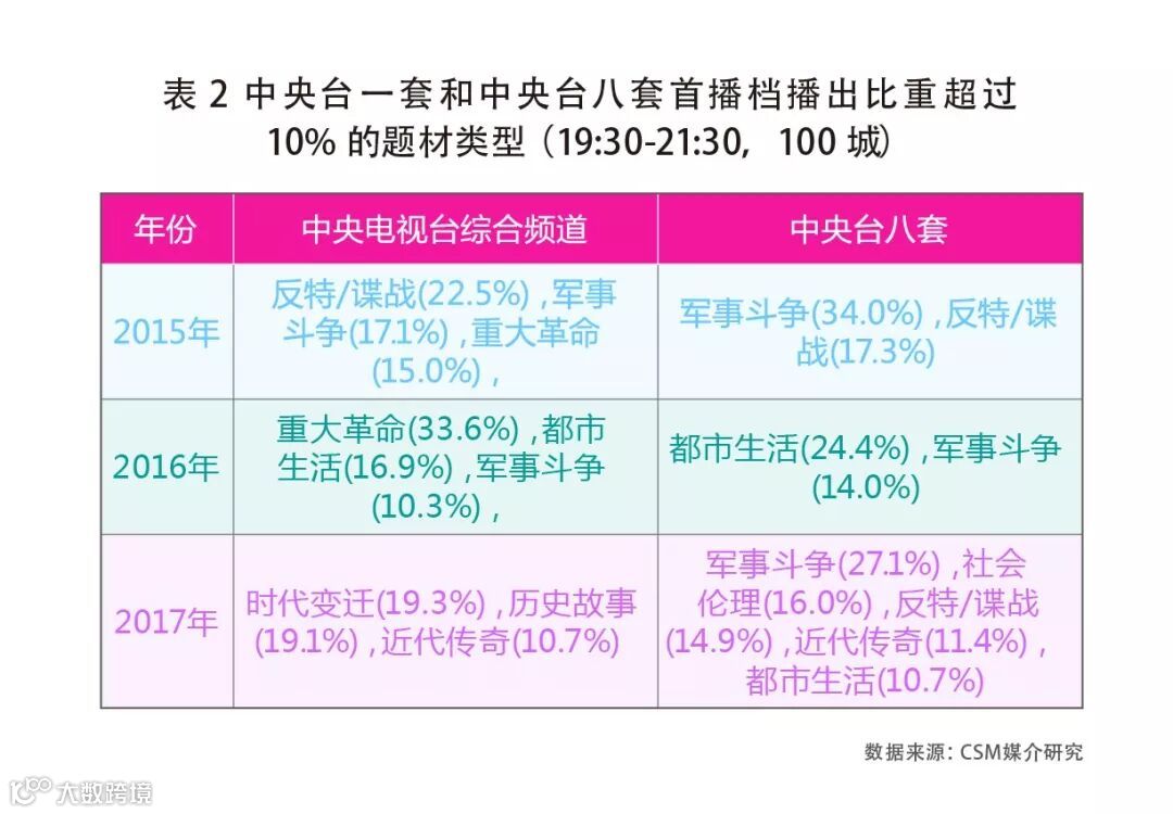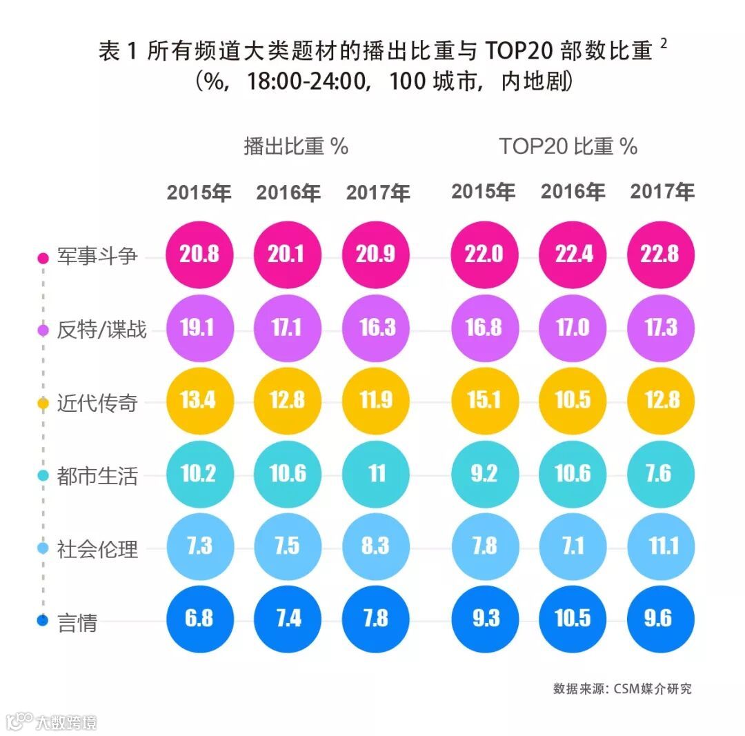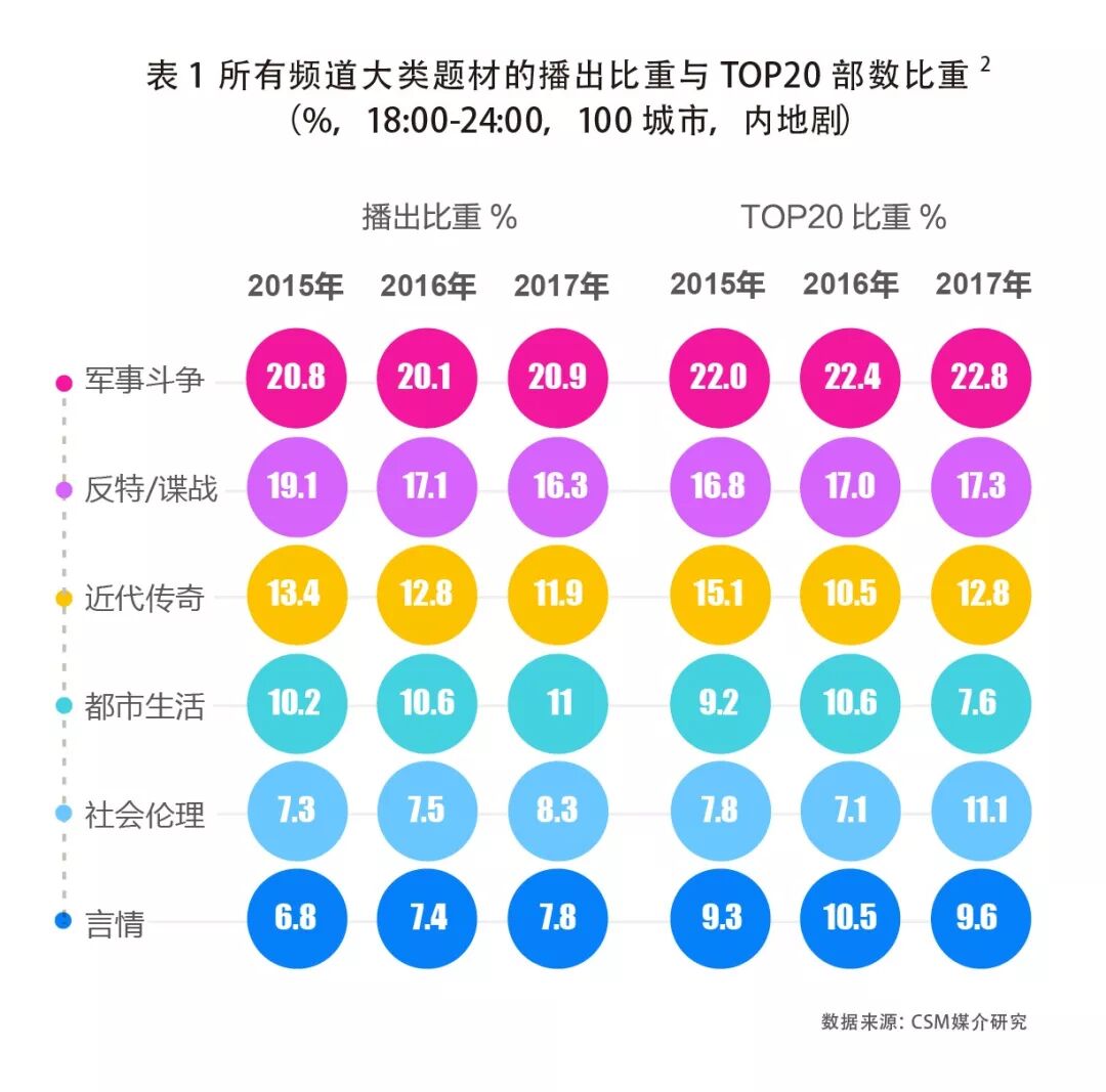 近年来我国电视剧市场一个明显特征是播出平台的大类题材固定化,军事斗争、反特/谍战、近代传奇、都市生活这四大类题材在所有频道中的播出比重居高不下,连续三年均超过10%,占总播出量六成。特别是军事斗争题材连续三年凭借20%的播出份额成为名副其实的支柱类型,反特/谍战剧紧随其后,约占16-19%,近代传奇约占10-11%。收视市场上,这四大类题材表现强势,涌现的好剧比例也大体和播出比例相匹配,占TOP20部数比重达六成,尤其是军事斗争题材所占好剧比重接近23%,反特/谍战题材突破17%,近代传奇也在10-15%左右。社会伦理题材在2017年的收视表现较为惊艳,好剧比重较2016年上升4个百分点,达到11.1%。