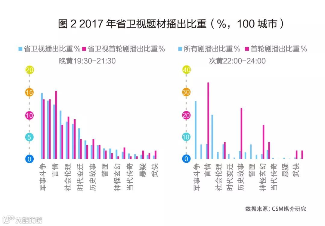 省卫视的题材则有“柔和化”趋势,2017年播出比重超过10%的大类题材,尽管仍包括“军事斗争”、“都市生活”和“反特/谍战”这三大类,但言情剧却出现了变数,成为代替“近代传奇”的新大类题材,占到12.3%。言情剧关注青年之间情感关系、风花雪月,“人畜无害”,看起来既轻松又养眼,契合了当下观众结构年轻化、创作方式表达年轻化的需求与趋势,而且也大多不涉及政治、革命战争等貌似沉重的领域,不仅成为省卫视晚黄时段首轮剧的首选题材,部数比重突破15%,而且在22:00档的次黄时段也成为第一大题材,播出比重高达35%,远超其他类型。