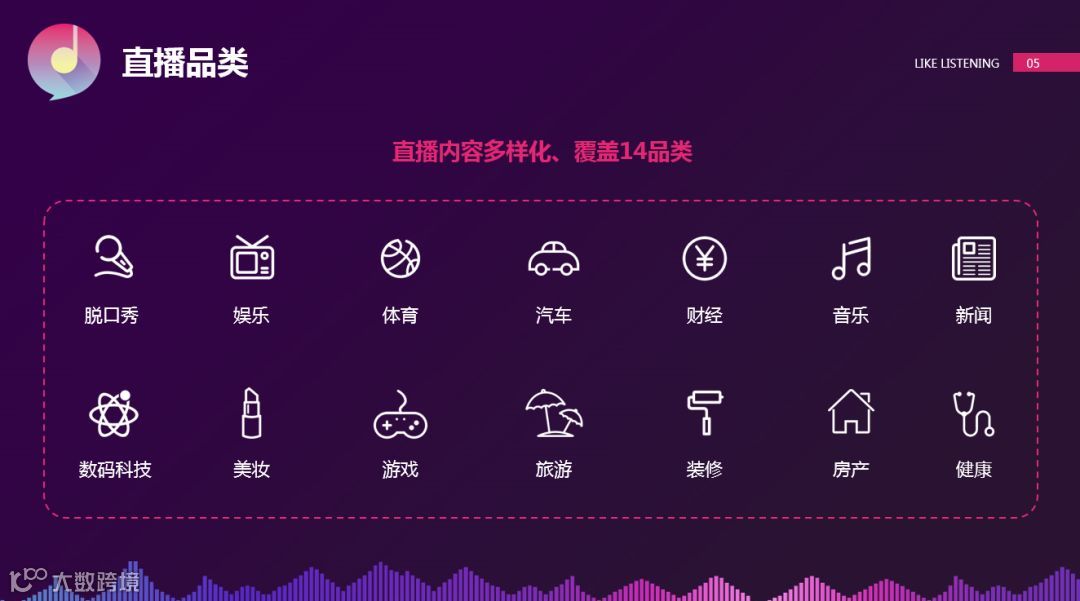 现在各个广播频道提供的节目类似,我们自己也开发多元化的直播自媒体内容。除了调频以外,我们还有来自各个阶层的适合在上面直播的内容,我们提供平台供PUGC使用,目前直播的内容多样化,覆盖近20个大品类。每月我们会放榜收听栏目的数据变化,部分优质主播的收听量和点赞打赏量非常高,有的部分栏目一直保持前十,有的栏目有所下降,这些取决于主播的能量。