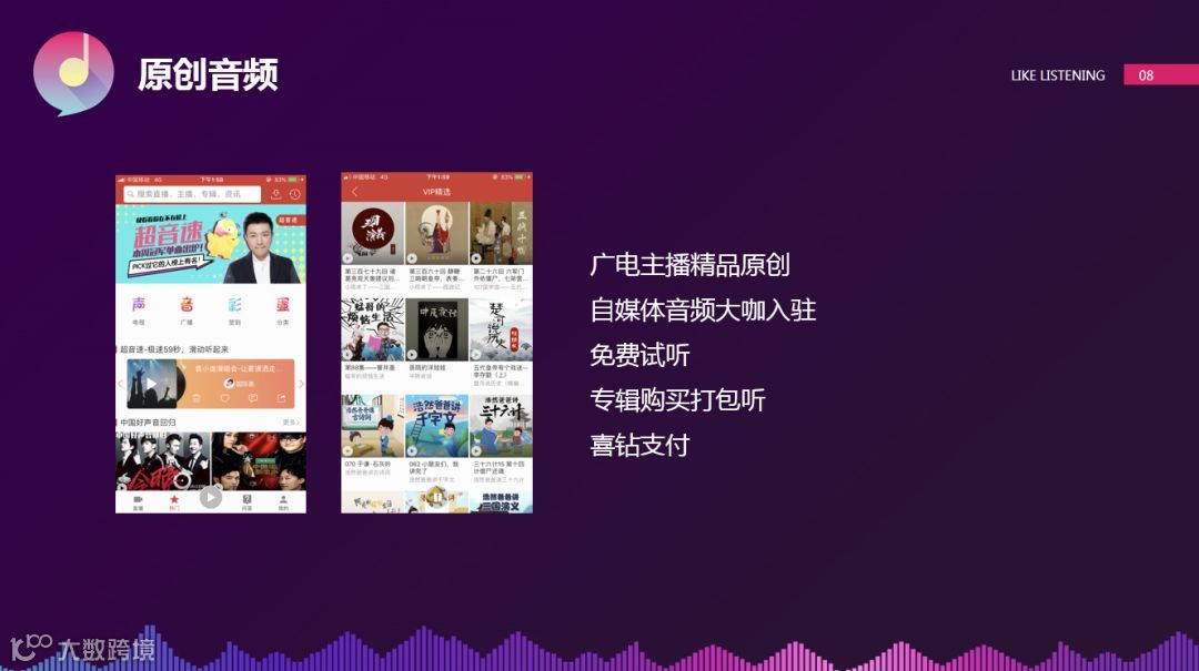“喜欢听”有一个大板块是专门做内容听觉产品,所有都是自有版权。我们没有做第三方产权引入,也不考虑砸重金烧钱去购买一些市场大咖的内容生产,我们就做一个实验性平台,让自己能控制的生产版权方提供内容。在这个过程中,我们从各种内容场景出发,让大量主播在平台上尝试各种各样的玩法。有数据的留下来,没有数据的淘汰,淘汰的产品很多,留存下来的内容也比较多。大量的内容要有差别就要VIP付费,无论如何要在平台上有购买行为,我们希望用这样的方式养成用户在平台上支付的习惯。第一阶段追求的不是用户量大,而是要求用户在这里说话、消费和生成大量原创的内容产品。
