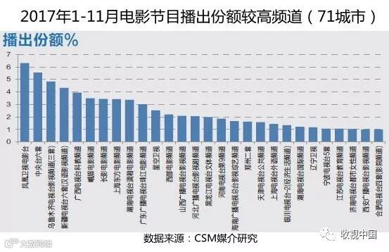 2017年1-11月,在71城市中,有159个频道播放过电影节目,其中播出份额超过1%的频道有28个,占比为17.6%。作为内地唯一的上星电影频道,中央台六套依托繁荣的中国电影市场,坐拥庞大的电影版权库,电影节目的播出份额遥遥领先,占比达5.54%。此外,峨眉电影频道、长影电影频道、潇湘电影频道、上海东方电影频道、珠江电影频道、西部电影频道、广西科教频道和河南电视台第9频道等电影频道电影资源的投放量均名列前茅,体现出了专业电影频道的力量和中国电影传媒的力量。