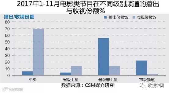 再从收视情况来看,观众收看最多的是中央级频道所播出的电影类节目,占收看总时长近七成,省级非上星频道和市级频道占总时长的17%,省级上星频道吸引了14%的收视。