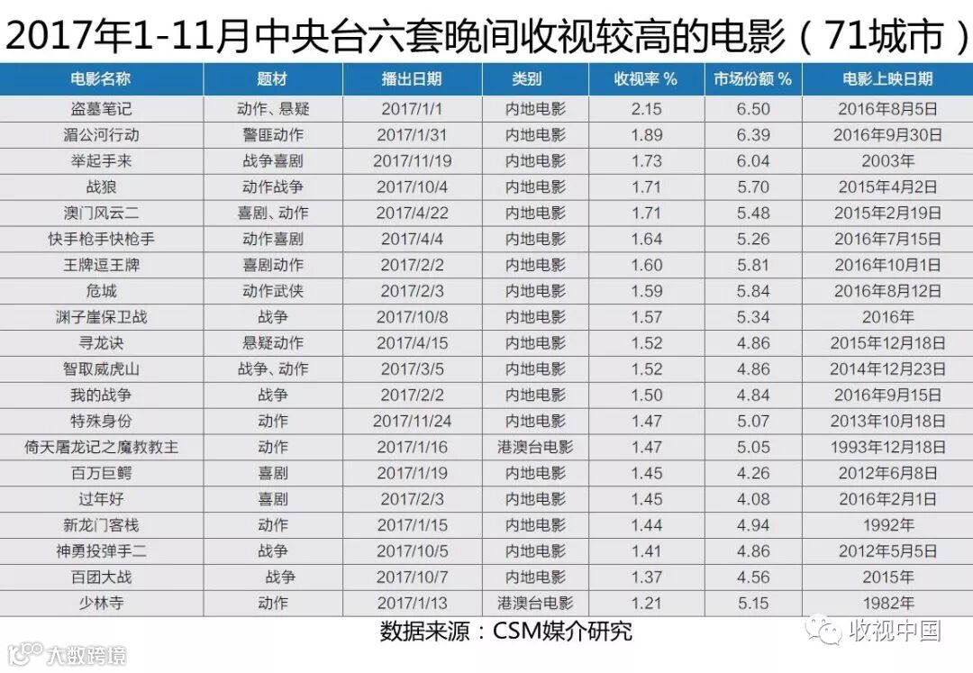 2017年,喜剧题材、动作题材和抗战题材的影片热播于中央台六套,中央六套收视排名前二十位的电影类节目主要由这三种题材包揽。值得一提的是,热门IP电影无论是在影院大屏还是电视小屏上都受到了观众的追捧。2017年1-11月,收视居于首位的就是大IP《盗墓笔记》。该片改编自南派三叔的同名小说,讲述了醉心于古建筑的吴邪在三叔的带领下,与张起灵、阿宁、潘子、王胖子,开始了一场前所未有的冒险故事。该片在2016年收获了10.04亿元的票房收入,在71城市组合市场也赢得了2.15%的收视率和6.5%的市场份额;根据“10·5中国船员金三角遇害事件”(湄公河惨案)这一真实IP改编,讲述了一支行动小组为解开中国商船船员遇害所隐藏的阴谋,缉拿案件幕后黑手的故事《湄公河行动》,在2016年收获了11.84亿元的票房,2017年在电视收视市场上同样获得了极高的关注(收视率1.89%,市场份额6.39%)。此外,《寻龙诀》、《智取威虎山》等IP电影也均跻身收视前十位。