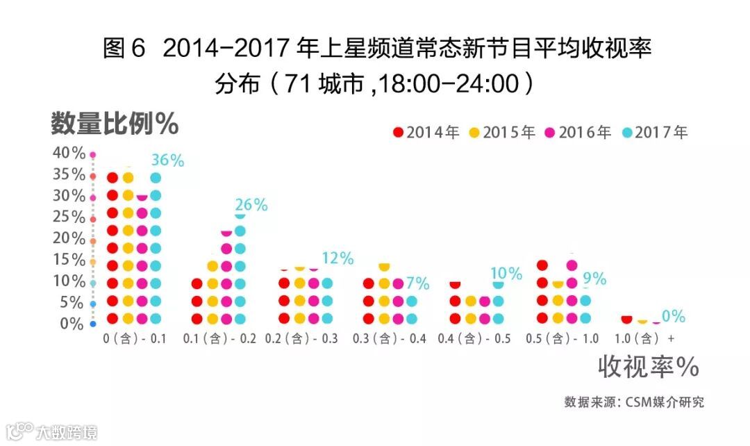 尽管近年来各级频道电视节目创新都朝着更为理性的方向发展,常态节目创新数量回落,但在传统媒体市场整体竞争力难免颓势的大背景下,常态新节目的吸睛能力也并不乐观。综观2017年晚间时段上星频道常态新节目的平均收视水平,高收视新节目占比较前三年进一步下降,平均收视率在0.5%及以上的常态新节目占比仅为9%,较2016年的18%和2015年的11%明显减少。与此同时,收视率在0.2%以下的新节目占比超六成,较2016年增多。