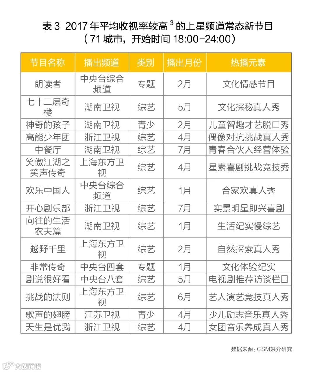 综观2017年上星频道晚间时段平均收视率较高的常态新节目,我们可以发现文化、喜剧和青春励志元素在高收视新节目中层见叠出。中央台综合频道文化情感节目《朗读者》、湖南卫视文化探秘真人秀《七十二层奇楼》、中央台四套文化体验纪实节目《非常传奇》以文化视角引领荧屏正能量和价值风尚;上海东方卫视星素喜剧挑战竞技秀《笑傲江湖之笑声传奇》、中央台综合频道合家欢真人秀《欢乐中国人》、浙江卫视实景明星即兴喜剧《开心剧乐部》以喜剧为切入点引发受众的追捧;湖南卫视儿童智趣才艺脱口秀《神奇的孩子》、浙江卫视偶像对抗挑战真人秀《高能少年团》、江苏卫视少儿励志音乐真人秀《歌声的翅膀》、浙江卫视女团音乐养成真人秀《天生是优我》则以满满的青春能量在创新市场掀起年轻化的追寻和探索,为荧屏带来青春力量。