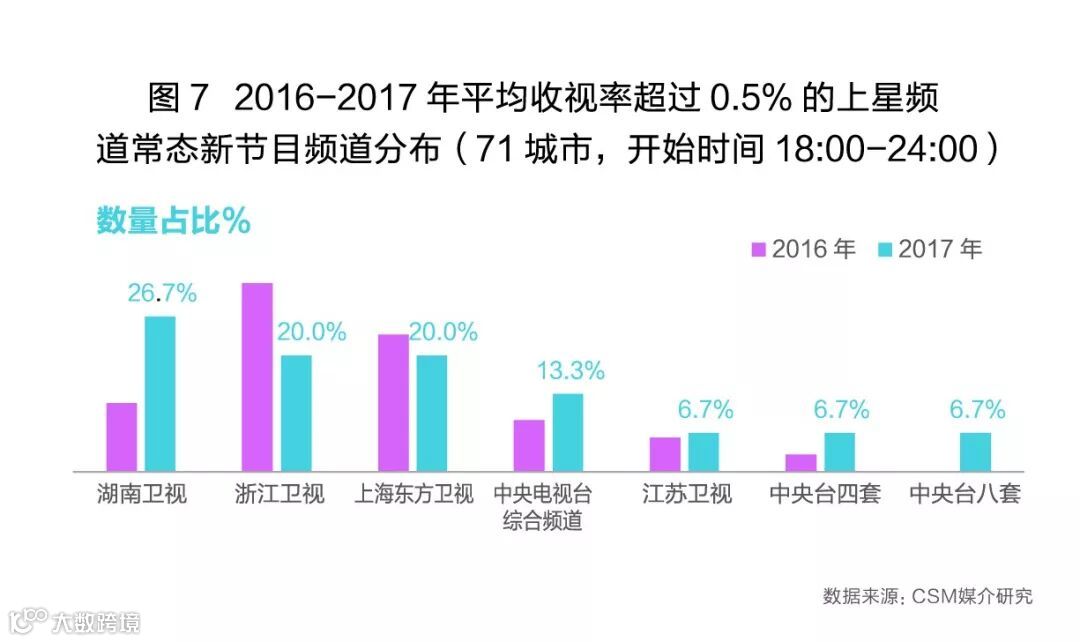 从新节目的播出平台来看,高收视常态新节目有进一步向头部卫视集中的趋势。2017年,平均收视率超过0.5%的常态新节目,进一步集中于湖南、浙江、上海东方卫视等头部卫视频道,三个频道播出的高收视新节目占所有上星频道的近七成。中央级频道中,综合频道、四套和八套2017年的高收视新节目占比也均较上年明显增长。