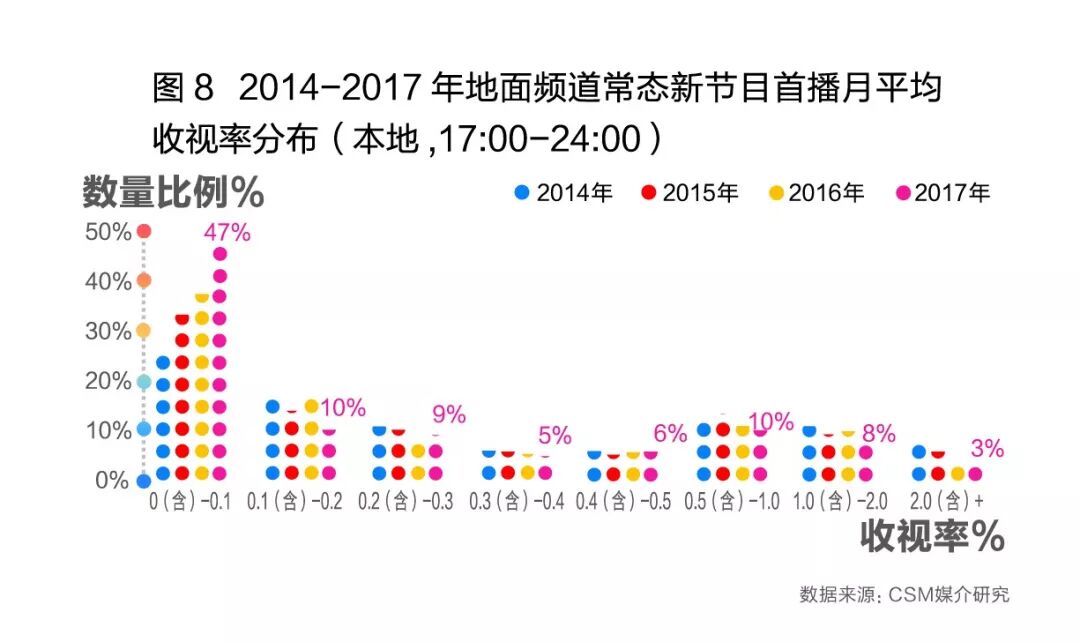 在整体收视市场竞争中优势不断旁落的地面频道,在节目创新中的压力也日益增大。2017年晚间时段,地面频道播出的常态新节目中,首播月在本地收视率达到1%及以上的节目数量较前三年进一步萎缩,所占比例仅为11%。而收视率在0.1%以下的低收视常态新节目比例则明显增长,已经占到总量的近一半。地面频道在节目创新的道路上,仍面临着巨大的资源和竞争压力。