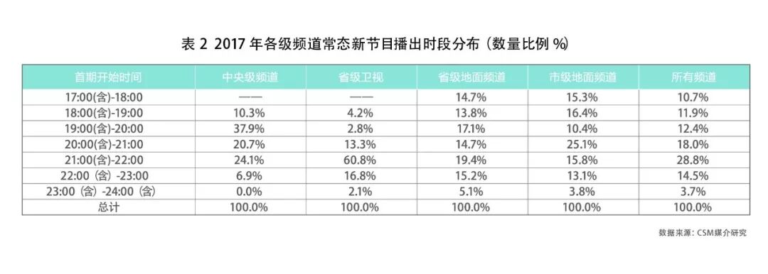 根据CSM媒介研究近年来对新节目播出规律的持续追踪,各级电视频道推出的常态新节目有向后黄金时段不断集中的趋势,其中21:00-22:00之间开播的新节目数量占比最高。2013年所有频道中开始时间在21:00-22:00之间的常态新节目数量占比为23.0%,2014年这一数值上升至25.0%;2015年以来,在广电新政的影响下,新节目向这一时段集中的趋势稳定,开播于21:00-22:00之间的新节目占比基本保持在29%左右(2015年29.9%,2016年29.1%,2017年28.8%)。