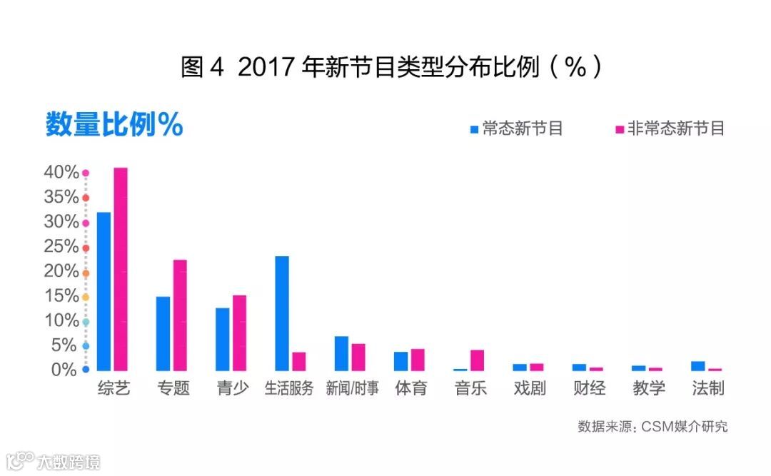 从节目创新总量来看,综艺、专题和青少类节目依然是2017年电视节目创新最为集中的三大领域,其中综艺节目更是以绝对的领先优势成为电视节目创新的最热点类型,其在常态新节目中占比达到32%,在非常态新节目中占比达41%。专题和青少节目近年来在电视节目去娱乐化政策导向之下也迎来新的发展,成为综艺节目之外的热点创新领域。生活服务类节目,由于其特殊的服务性、贴近性,在常态新节目中的数量占比甚至超越专题和青少节目,成为仅次于综艺节目的第二大创新类型。