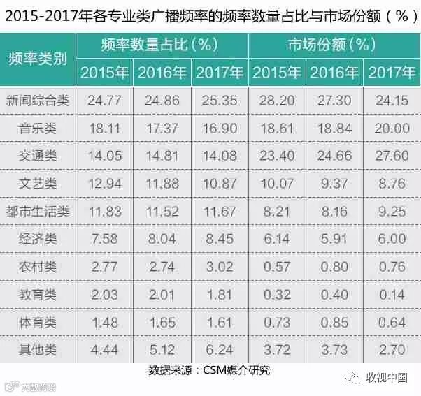 2015-2017年各专业类广播频率的数量占比,新闻综合类、音乐类和交通类频率占据前三强,文艺类和都市生活类频率占比每年也均超过10%。其中,新闻综合类频率的数量占比逐年增加,但市场份额却下行。音乐类频率的数量比例持续减少,而市场份额则有所提升。交通类频率近三年的数量比例基本稳定,市场份额则连年增长。尤其2017年,音乐类和交通类频率的市场份额涨幅都相对明显。