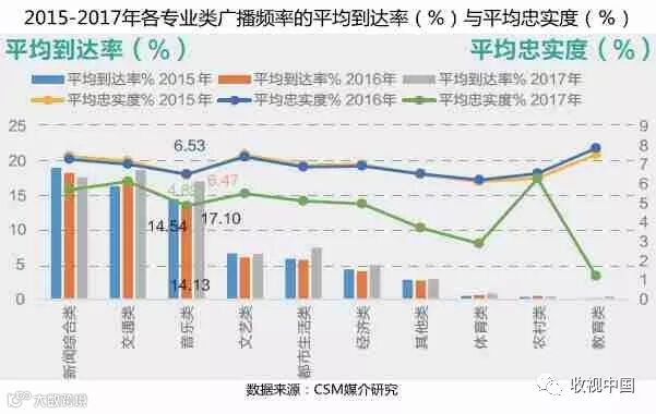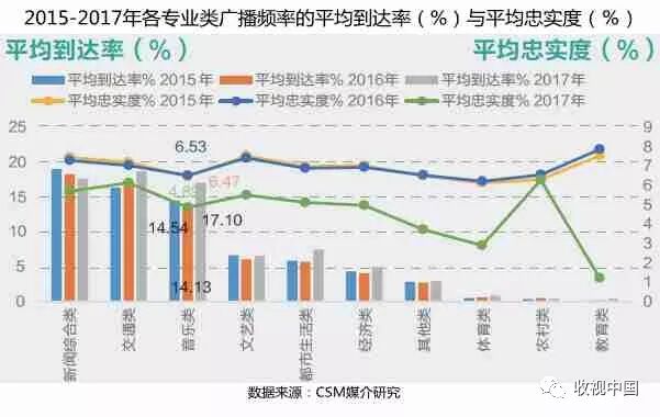 2017年,音乐类频率的平均到达率较前两年提升,与去年同期相比增幅为21.02%,交通类频率增幅为9.51%,而新闻综合类频率的平均到达率出现下降,降幅为3.49%。此外,经济类频率增幅超过20%,都市生活类频率增幅接近30%,体育和教育类频率增幅分别为35.82%和88%,农村类频率则降幅为13.56%。各类频率的平均忠实度则整体呈现下降趋势,2017年与2016年相比,音乐类频率平均忠实度降幅为25.11%,新闻综合类频率降幅为21.64%,交通类频率降幅为12.77%。比较各专业类广播频率的平均到达率可见,2017年交通类频率取代新闻综合类频率,排在各类型频率之首,新闻综合类和音乐类频率排在第二、第三位。2017年平均忠实度最高的广播频率是农村类,其次为交通类频率,新闻综合类频率排在第三位,音乐类频率的排名则相对靠后居第七位。