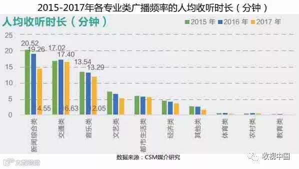 广播的“三大支柱”频率——新闻综合、交通和音乐类频率2017年的人均收听时长与2016年相比均出现下降。其中,新闻综合类频率的降幅最高,达到24.45%,音乐类频率降幅为9.33%,交通类频率降幅为4.43%。新闻综合类和音乐类频率的人均收听时长逐年下降,交通类频率则是未能保持增长态势,2017年开始滑落。