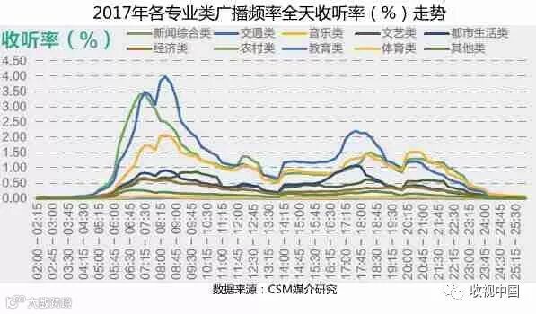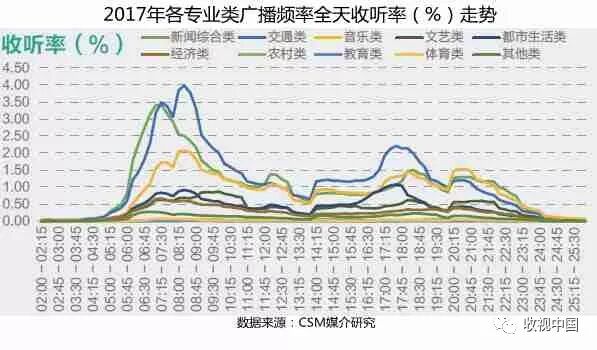 “一日之计在于晨”,新闻综合、交通、音乐三大类广播频率的收听最高峰基本位于早间6:00至上午11:00左右,其中6:00-7:15时段新闻综合类频率占据收听优势,7:15-11:00时段交通类频率收听领先。12:00-13:00左右,交通和音乐类频率收听回弹,出现午间的收听“小山丘”。音乐类频率自下午13:30开始,收听率呈现出波浪式的上升态势,分别于14:00-15:00,17:00-19:00和20:00-21:30出现三次波峰。其中,晚间20:00-21:30的90分钟,音乐类频率的收听率领先于其余各类广播频率,形成了音乐类频率的晚间“黄金90分”。