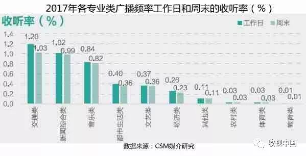 2017年,各类广播频率工作日的收听率整体优于休息日。其中,交通类频率工作日和周末的收听率差别在各类广播频率中最大,周末相较工作日收听率降幅为14.17%。音乐类频率和新闻综合类频率工作日和周末的收听率差别较小,相对稳定。