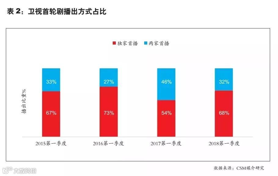 自2015年 “一剧两星”政策实施以来,卫视晚黄金档首轮新剧趋少态势明显:2018年第一季度首播新剧34部,相比2015年同期的60部下降了近一半;与2016年同期的45部和2017年同期的41部相比,下降趋势明显。按照独播和联播的播出方式观察首轮剧(表2),虽然独播购剧成本更高,但由于减少了其他频道分流观众和广告,独播方式已经成为首轮剧播出主流,占到市场的7成左右。