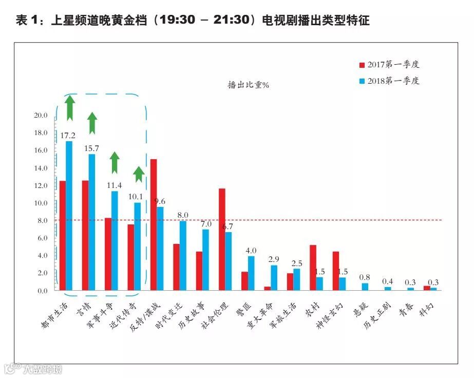 电视剧播出贴近百姓生活。在上星频道首播剧目中,2018年第一季度上星频道累计播出34部首播剧,按照故事年代可划分为当代剧、年代剧、古装剧和跨越剧4种类型。2018年第一季度首播剧整体特征表现为当代剧激增:当代剧比例占7成,相比去年同期大幅度提升;跨越剧仅播出1部;年代剧数量与去年基本持平。首播剧热播题材偏重当代剧,各类贴近生活和情感的现实题材剧占据主流,涌现出《恋爱先生》《美好生活》《好久不见》《谈判官》《老男孩》《我的青春遇见你》《一路繁花相送》等高收视率现实题材剧目。