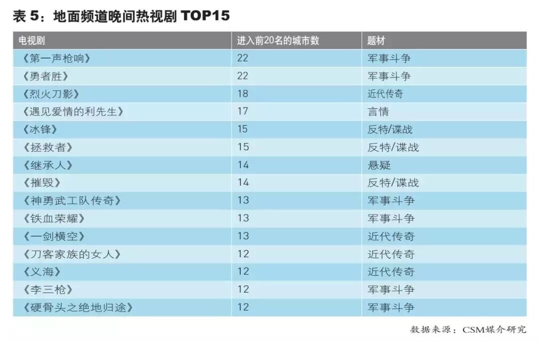 从收视效果观察地面频道晚间热视剧(表5):“硬剧”题材如军事斗争、近代传奇、反特/谍战剧表现突出。在热视剧前15个剧目中,军事斗争题材6部,近代传奇题材4部,反特/谍战3部;剩余1部为言情剧,1部为悬疑剧。地面频道,无论播出和收视情况均表现为硬剧当道。