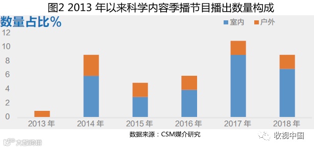 2018年以来已经播出的9档“科技”节目的多以江苏卫视《最强大脑》、浙江卫视《小儿大医生》等演播室综艺为主,有户外部分的节目则主要集中在中央台出品的节目,一方面是那些无法在室内完成的实验会转移到户外进行,如《极客出发》,另一方面也与节目内容的设置相关,如《正大综艺动物来了》节目中场内紧张答题,而场外的观察员则带领观众“潜入”各大动物园,带来一线的动物故事。与2016年以来爆发的娱乐性更强的户外形式综艺节目不同,户外形式的科学节目所占比例一直相对较低,相比之下,七成以上的纯“科学”节目还是更多依靠棚内专家解说科学原理来完成(图2)。