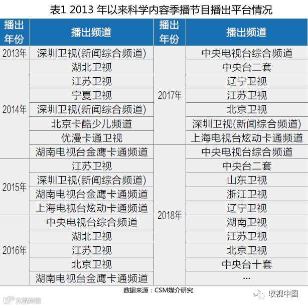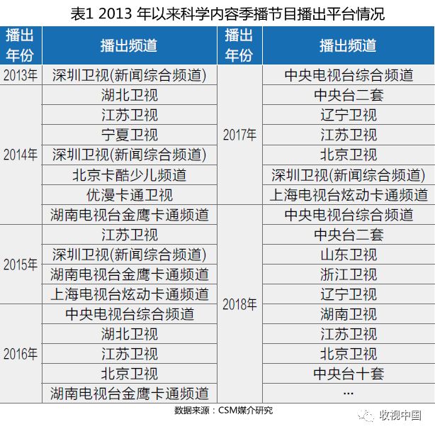 从“科学”节目播出平台来看,2014年北京卡酷少儿频道、优漫卡通卫视、湖南电视台金鹰卡通频道等少儿专业频道占“科学”内容节目播出平台的42.9%,2017年这个比例减少到14.3%,而截止到5月19日,2018年纯“科学”节目都集中在中央台综合频道、山东卫视、浙江卫视这样的综合性频道播出,少儿专业频道尚未有播出。“科学”节目播出平台逐渐从专业频道开始向节目资源覆盖面更广的综合性频道扩展,这都得益于制作者们在曾经“高冷”、“教条“的科学节目中引入各种综艺娱乐元素,拉近了观众和节目的距离,慢慢改变了观众心中对“科学”节目就是冷冰冰的刻板印象,有效拓宽节目可播出的渠道,综合性频道开始积极进入”科学“节目市场(表1)。