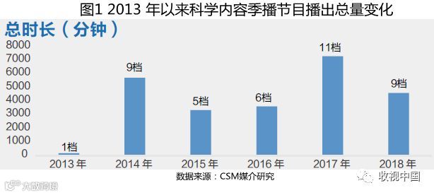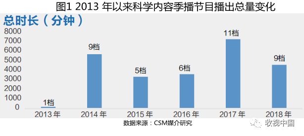 近年来,相关主管部门鼓励上星频道在黄金时段增加公益、文化、科技、经济类节目的播出数量,在这一指导思想下,中央台和多家省级卫视纷纷放眼“科技”。从2013年以来的季播节目数据中可以发现,以科学为主要内容的季播节目播出总量呈上升态势,截至2018年3月12日,2018年的播出总量就已经达到了2017年全年播出总量的62.9%(图1)。从2013年只有1档发展到2017年11档,节目播出数量翻了十倍,增幅惊人。2018年以来也已经开播了湖南卫视《亲亲我的宝贝》、浙江卫视《小儿大医生》等9档“科学”内容节目开播,且据频道和网络平台宣传,还有多档科技节目待播。