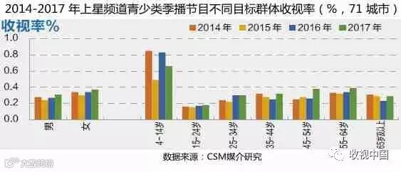 不同类型观众对于青少类季播节目的收视表现有所差异,其中,女性观众高于男性观众;4-14岁始终是收视的绝对主力,收视率较高,此外,35-64岁人群收视也较为明显。相较于2014年至2016年,2017年35-54岁的人群收视提升明显,这样的收视提升与伴随收视行为的增加有一定关系,但更多的还是与青少类季播节目制作日益精良紧密相关。