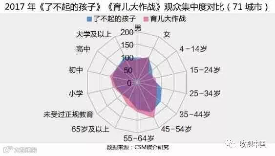 对比两档节目的观众集中度可以看出,《了不起的孩子》在4-14岁、25-44岁观众中的喜爱程度要高于《育儿大作战》;而45-54岁的中老年观众对于《育儿大作战》的喜爱程度最高,这也符合节目的观众定位。