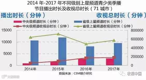 青少年群体在家庭中拥有特殊地位以及特定的收视兴趣和收视需要,而在这一群体收视的同时,家长们也往往陪伴左右,相当规模的青少年群体以及数量更大的青少年父母群体,为青少类节目创造了巨大的市场需求,越来越多的上星频道也因此参与到青少类节目的制作当中,这里面既涵盖了那些专业的青少类频道,如湖南金鹰、卡酷少儿等等,同时也囊括了诸多中央级和省级卫视频道。2014年至2017年的四年间,在打通的全国71城市组中,上星频道播出的青少类季播节目总时长相对稳定,2017年青少类季播节目全年播出量为210个小时,较2016年的184个小时提升了14.1%,而收视总时长方面也与播出时长呈现出相同的态势。