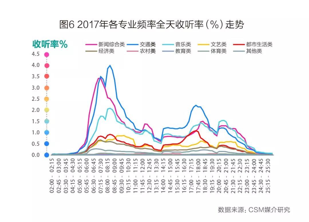 2017年各专业类别频率在不同收听场所的到达率数据显示,在所有场所,交通类频率以绝对优势位列榜首,音乐类频率位列其次,新闻综合类频率排名第三,然后依次为都市生活类、文艺类和经济类频率;从家中听众规模(到达率)来看,新闻综合类频率以微弱优势领先于其他类别频率,位居榜首,音乐类和交通类频率分居第二、三位,然后依次为都市生活类、文艺类和经济类频率;与所有场所类似,车上听众规模中,交通类频率独占鳌头,音乐类频率紧随其后,新闻综合类频率位列第三。由此不难看出,相较于交通和音乐类频率,目前新闻综合类频率在家中优势略有突出表现,但在所有场所和车上则逊色于这两类频率,究其原因,可能与这两类频率所播出的内容更实用、更具有休闲放松性不无关系。