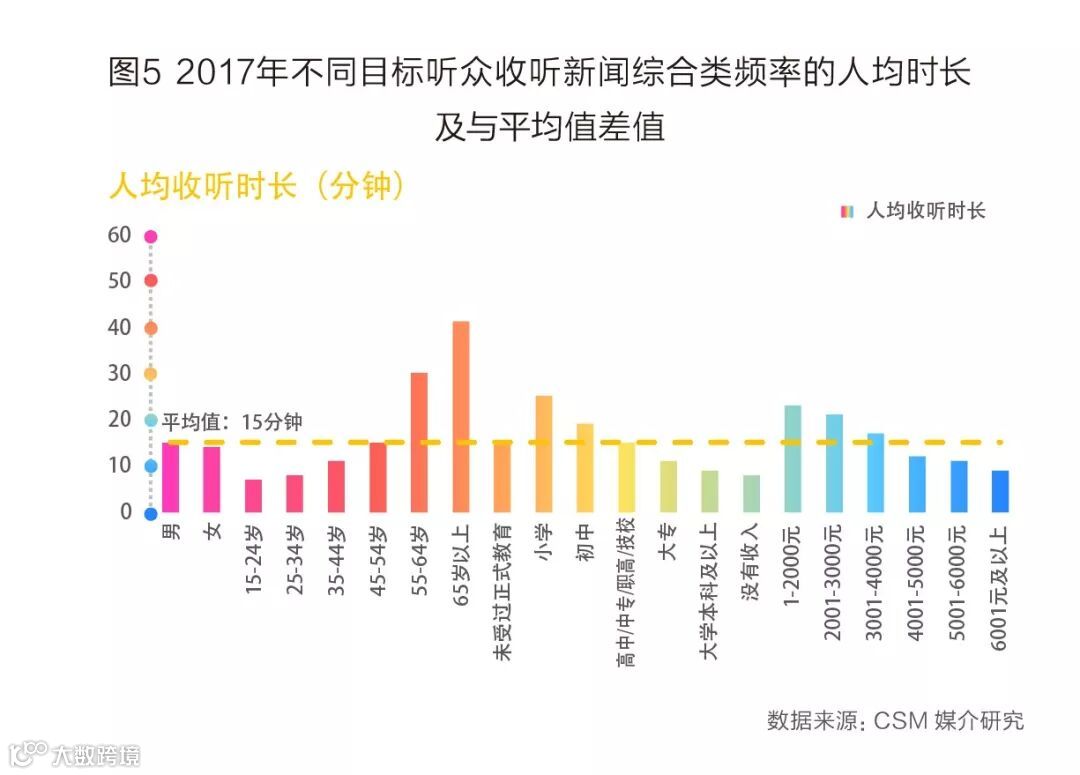 2017年,受众对新闻综合类频率的人均日收听时长为15分钟。从分目标人群人均每天收听新闻综合类频率的时长来看,男性听众人均每天收听该频率的时长为15分钟,平于平均值,女性听众为14分钟,略低于平均水平;不同年龄段听众整体呈现出年龄越大,收听该类频率时长越长的特征,具体而言,15-44岁人群低于平均水平,45岁及以上人群则高于平均水平,尤其是65岁及以上人群,人均收听新闻综合类频率的时长达到了41分钟,以较大优势领先于其他年龄段人群;与不同年龄段受众对该类频率的收听时长相反,受教育程度和收听新闻综合类频率的时长则呈现出学历越高,收听该类频率时长越短的特征,大专及以上学历人群对新闻综合类频率的人均日收听时长均低于平均水平;个人月收入水平与受教育程度类似,收入越高,对新闻综合类频率的关注度越低,包括无收入人群对该类频率的关注度也较低,1-4000元人群每天对新闻综合类频率的收听时长均高于平均水平。整体而言,中老年和中低收入者收听新闻综合类频率的时间较长,均高于平均水平。