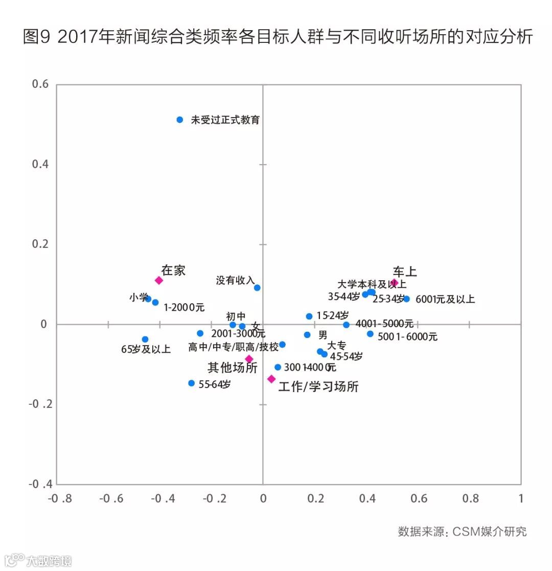 不同目标人群与收听新闻综合类频率的场所对应分析表明,受众本身的自然、社会属性和自身的工作生活习惯等因素决定了他们与自己“心仪”的收听场所高度契合。低学历和低收入人群更倾向于在家收听新闻综合类频率;白天大部分时段都在上班的中等收入、中等学历的中年男性更喜欢在工作/学习场所收听该类频率;选择在车上收听新闻综合类频率的听众身份特征更为鲜明,主要是由一些高学历、高收入、高频率开车或乘车的“三高”人群组成。
